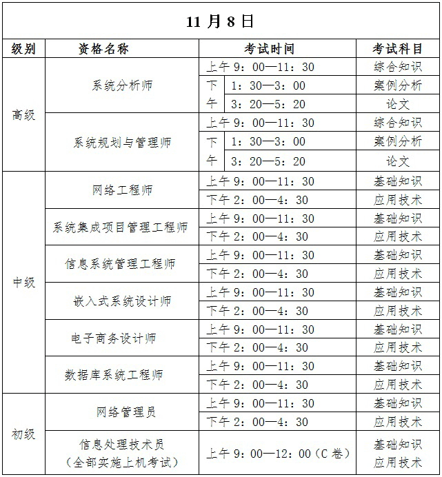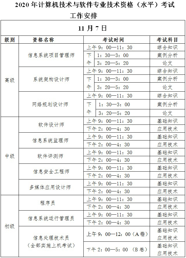 2020年6月16日,工业和信息化部教育与考试中心发布2020年计算机技术与软件专业技术资格(水平)考试安排有关事项的通知,通知明确2020年计算机技术与软件专业技术资格(水平)考试上半年和下半年考试科目合并于11月7日、8日举行。同时对11月7日和11月8日举行的考试科目进行了规定,根据通知: