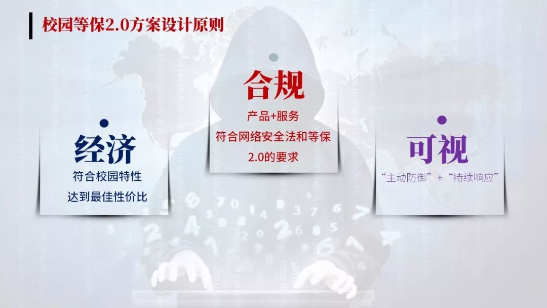 方案体现了网络安全产品和服务符合网络安全法和等保2.0的合规要求,同时满足校园对经济性的要求,符合校园的特点达到最佳性价比,最后实现了”主动防御,持续响应“对网络安全进行可视化管理。