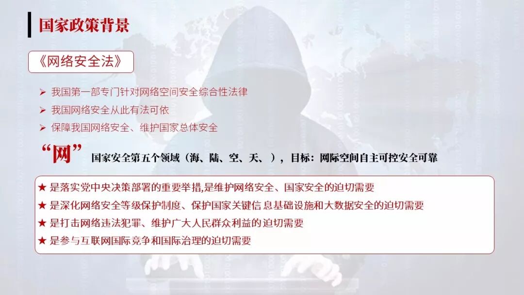 随着《网络安全法》的颁布,网络空间已经成为继“海、陆、空、天”之后的第5个国家主权领域。同时网络安全法确定了国家实行“网络安全等级保护制度”以保障国家网络空间的安全。