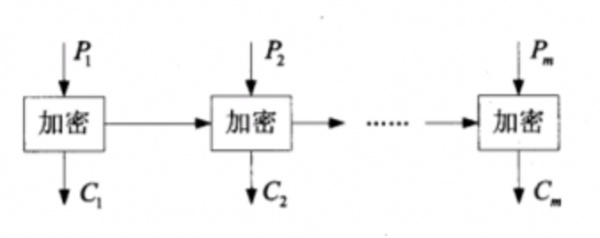 53、分组密码常用的工作模式包括:电码本模式(ECB模式)、密码反馈模式(CFB模式),密码分组链接模式(CBC模式),输出反馈模式(OFB模式)。下图描述的是( )模式(图中Pi表示明文分组,Ci表示密文分组)